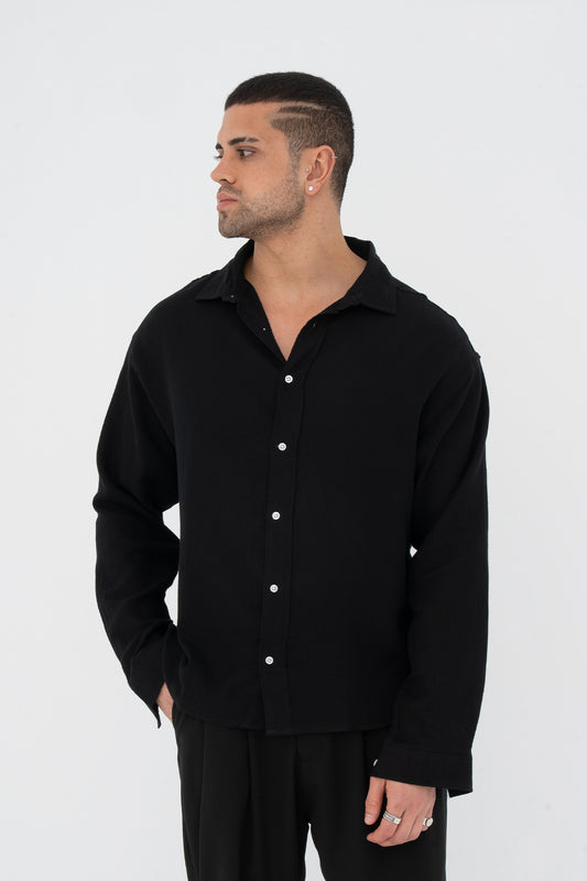 Oversize Fit Dokulu Uzun Kol Gömlek - Siyah