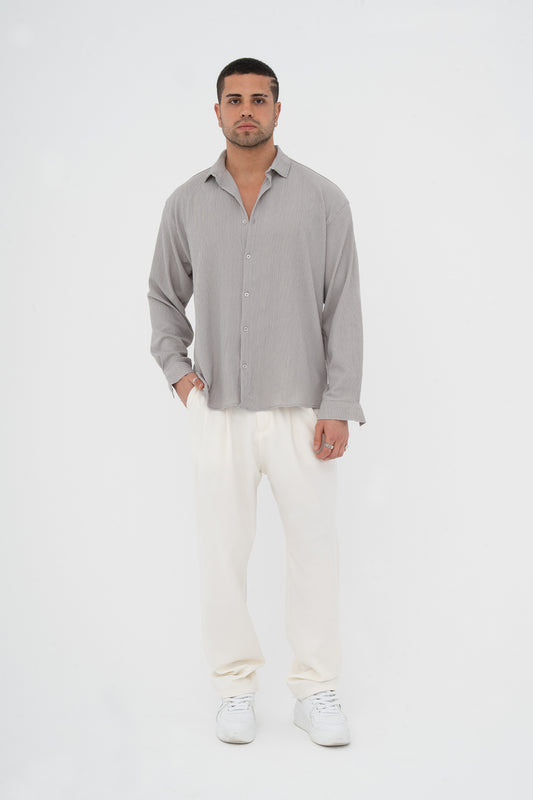 Oversize Fit Dokulu Uzun Kol Gömlek - Gri